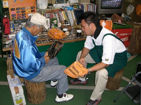ワイが持ていった全てのグラブをひとつひとつ丁寧にチェックし、さらにワンランクUP↑の型付け方法まで教えてくれた。マル秘だけどね!