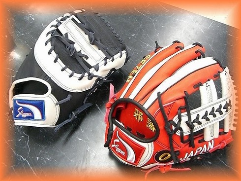 オーダーの場合は刺繍も入れれるから、右のグラブなんかは、3ヶ所入れてかつ○抜きで背番号まで入れるというこのこだわり!!