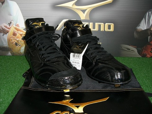 スパイクはミズノプロのハイカット¥29,400の最高級スパイクに、野手用の小振りな縫いPで、激シブ!!ワイえー仕事しとるわ(^。^)y-.。o○