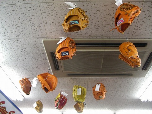 天井で吊るされたグラブ達。