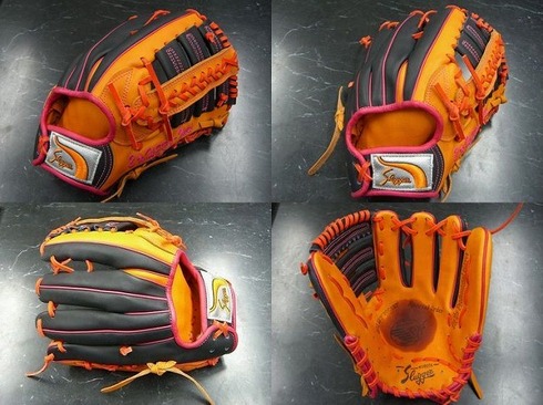 外野手用に加工されたグラブ。KSブラック×オレンジの相性のいい組み合わせに、ピンクを組み合わせた。