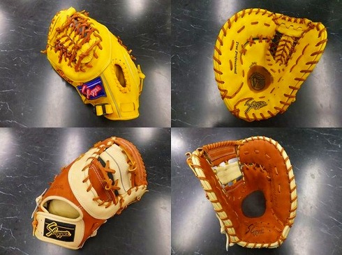 [上段] KSF-133 Gイエロー×タン 左投げ左投げ用ミットの加工はホンマに難しい!よく開いてよく閉じる様に加工済! [下段]KSF-433 ウッド×クリーム
