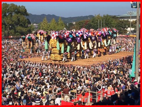 50台以上の高さ約5.5メートル、長さ約12メートル、重さ約2.5トンにもなる太鼓台を、総勢150人ほどの「かき夫」と呼ばれる担ぎ手らが担ぎ上げるその姿はまさに「圧巻」!!